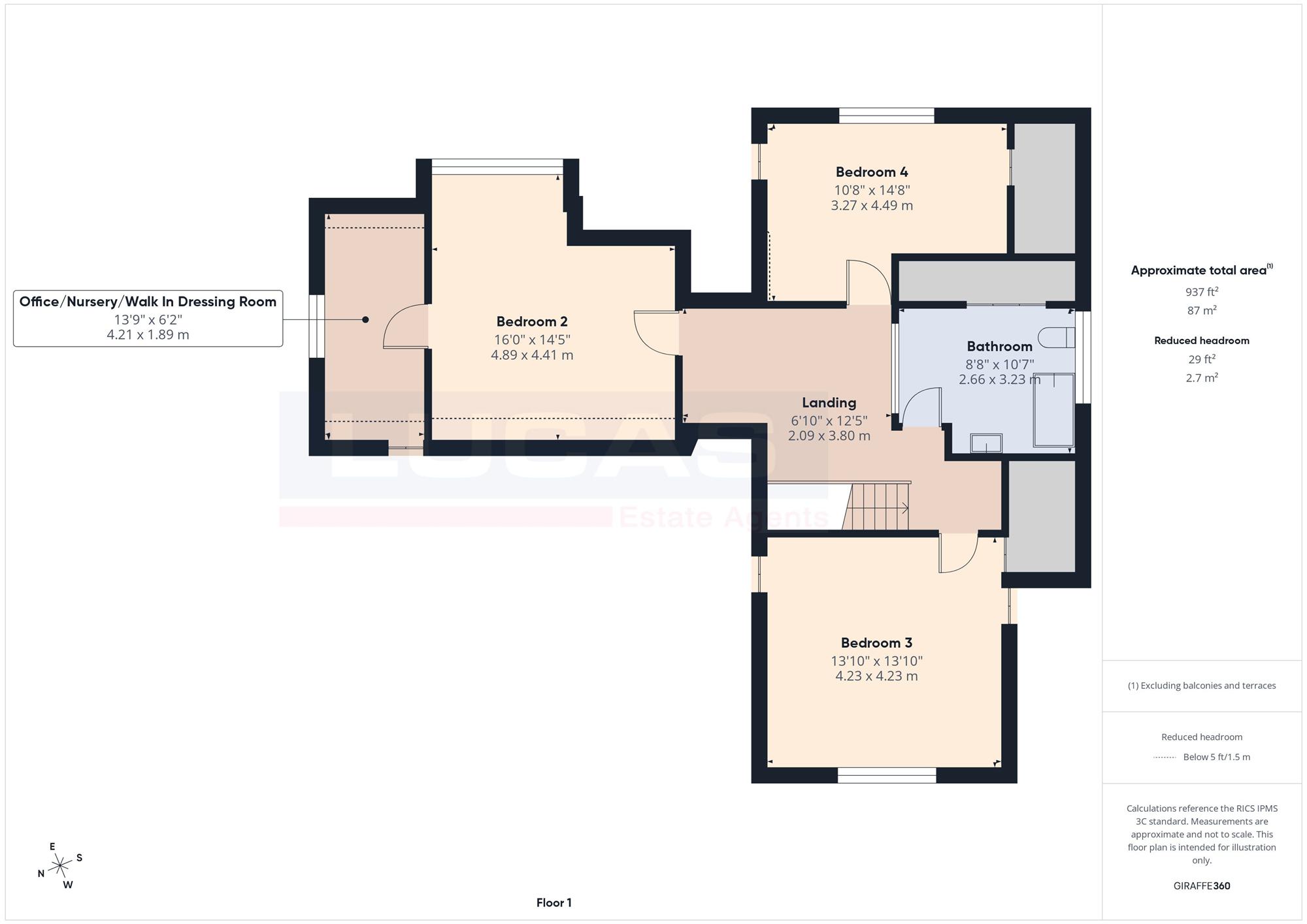 The first floor opens onto a large landing with a Velux roof light, leading to three further bedrooms: