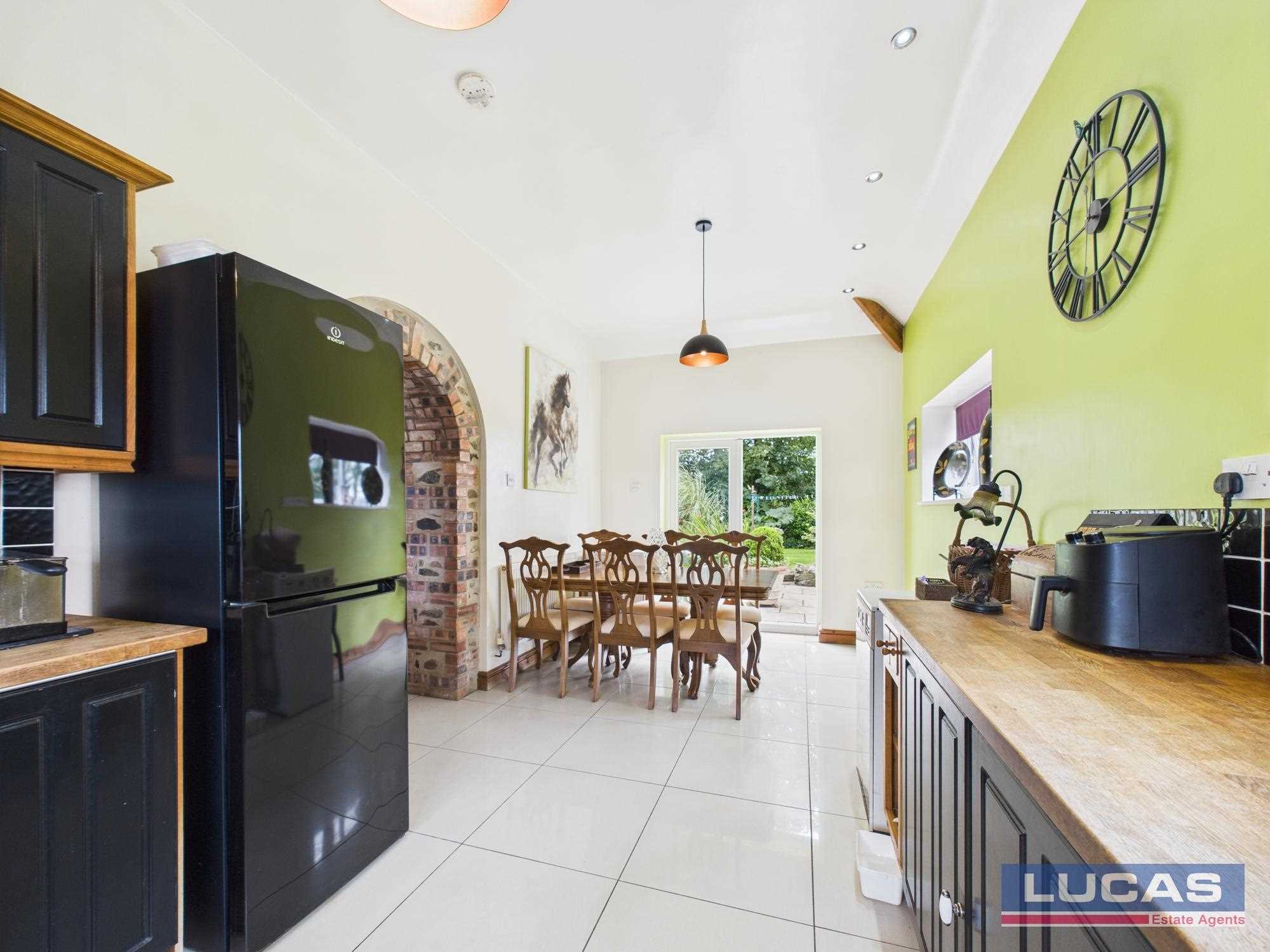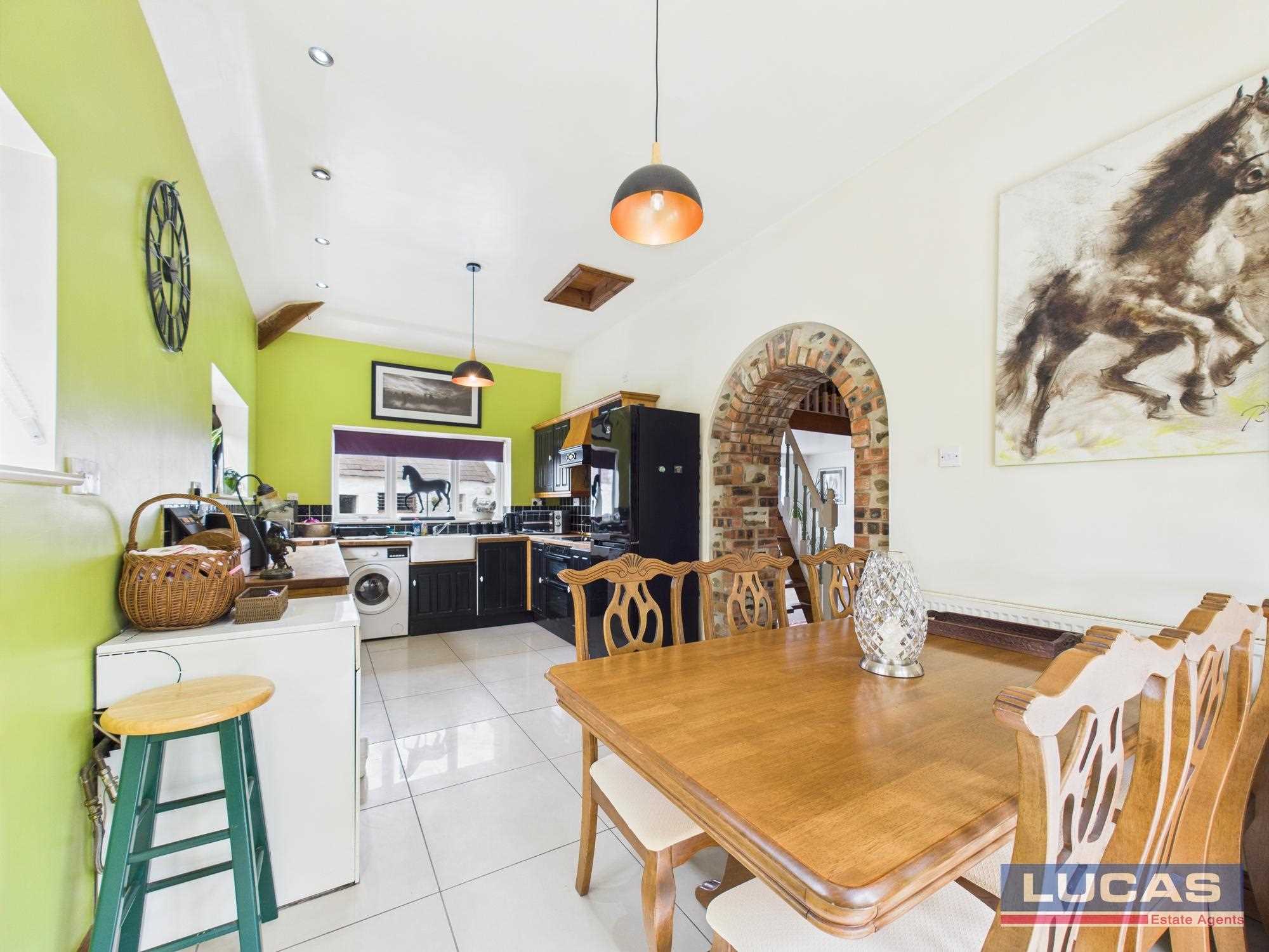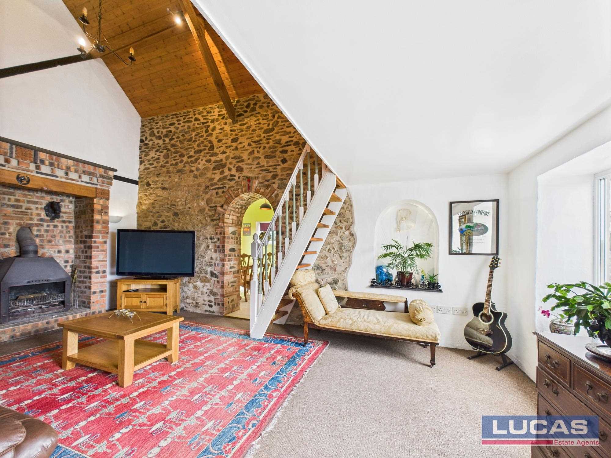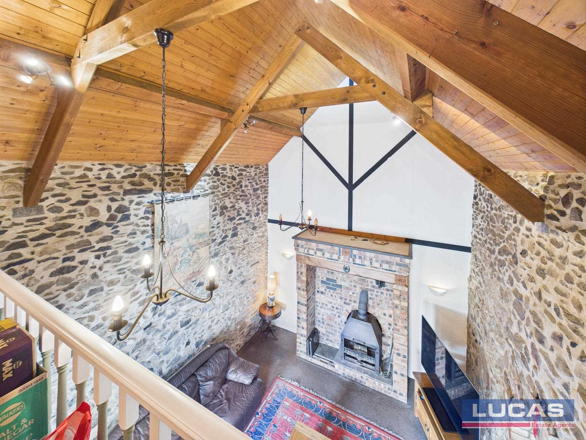 Continuing off the reception hallway is a door through to a very spacious stunning vaulted living room with dressed stone walls to two sides, attractive fireplace with multi fuel stove with brick surround with timber beam and recessed lighting, recessed alcove with lighting, two windows to front aspect, alternate tread wooden stairs to a mezzanine that overlooks the living room with space for studio/office, arched brick opening leading through into the kitchen/diner briefly comprising bespoke painted base and wall storage cupboards with complementary solid block work surfaces, Butlers sink with mixer tap, space for free standing washer, space for free standing fridge/freezer, built under double electric oven with ceramic hob and canopy extractor over, complementary floor tiling, complementary tiled splash backs, recessed lighting, window to front aspect, two clerestory windows to side aspect and French doors leading out to the rear patio and garden.