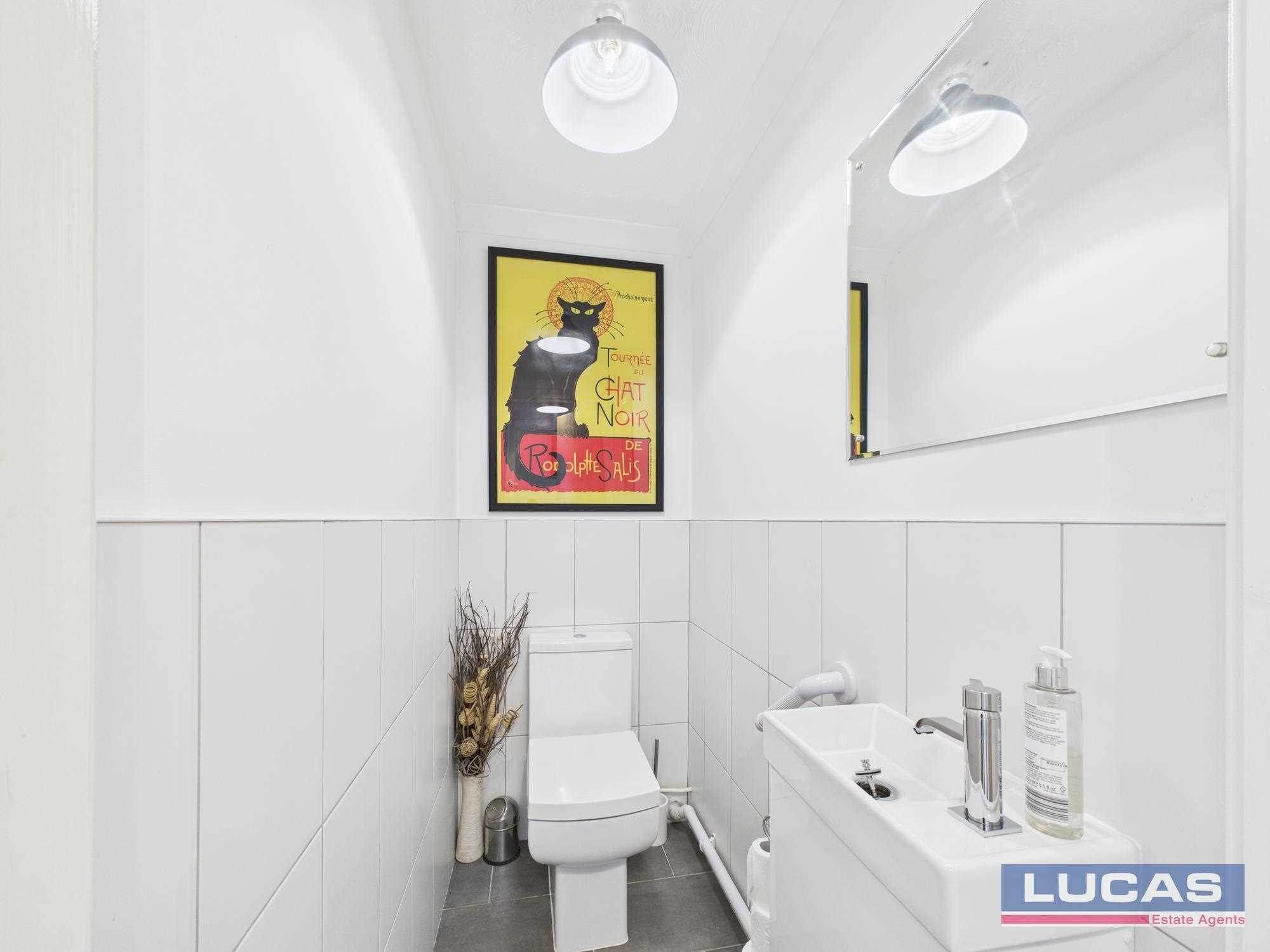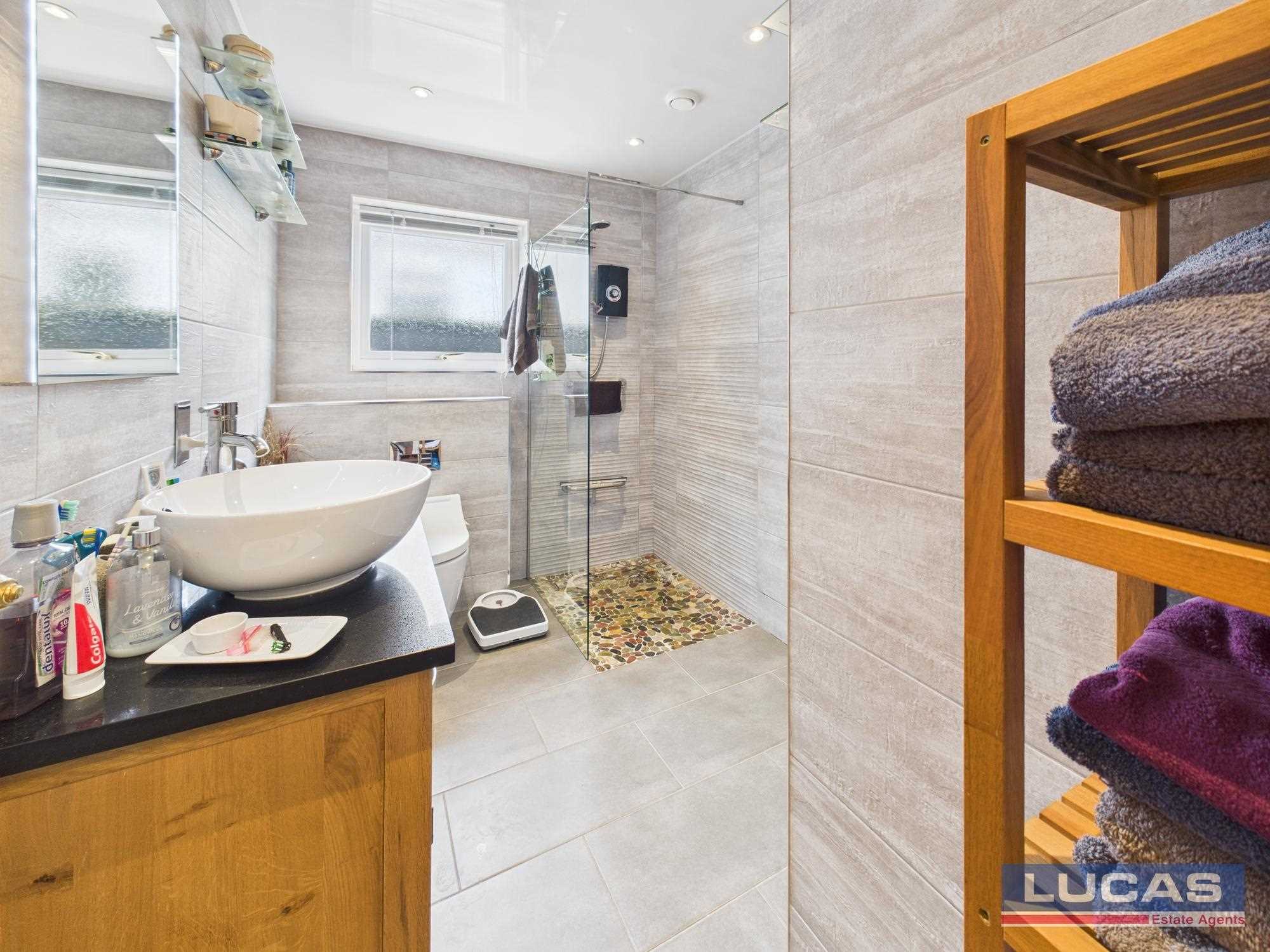 Further doors off the hallway into the king size bedroom 1 with a bank of built in wardrobes with louvred doors, coved ceiling and window to rear aspect overlooking the garden, double bedroom 2 with two single wardrobes with louvred doors, vertical electric wall mounted radiator, coved ceiling and window to rear aspect overlooking the garden, double bedroom 3/office with coved ceiling and window to side aspect, contemporary style L shaped bathroom suite with under floor heating and briefly comprising a cantilever back to the wall Wc, vanity sink unit with round bowl set on quartz top with mixer tap and storage cupboards under, stylish walk in electric shower with glass screen along with complementary tiled walls and mosaic flooring, chrome heated towel rail, recessed lighting, complementary floor and wall tiling and frosted window to side aspect, very useful separate Wc with low flush Wc, slimline floor standing vanity sink with mixer tap, extractor fan and complementary floor and half tiled walls.